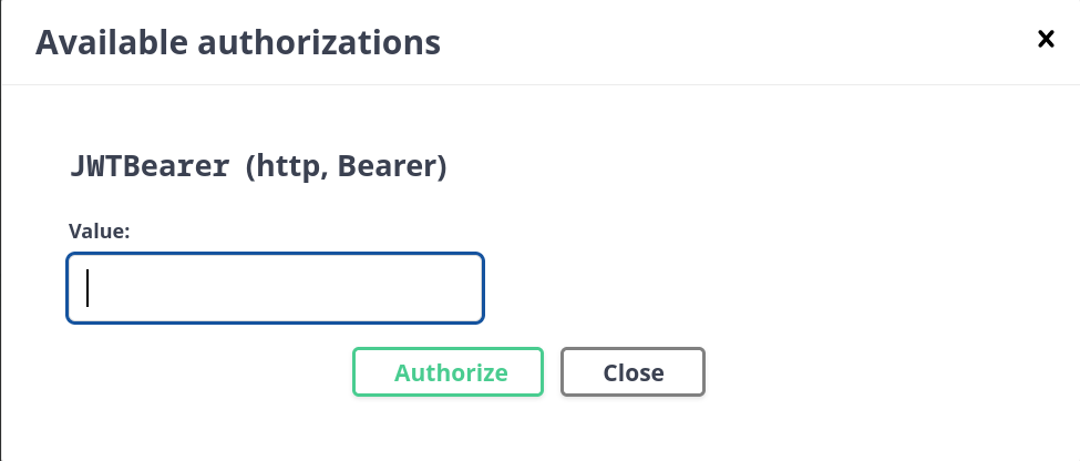 Que pide el token entregado, no debe anteponerse Bearer al token, sólo debe ingresarse el token. Una vez ingresado el token, todos los requests subsiguientes llevarán el token. Si se vuelve a hacer clic en el botón, se puede eliminar la autentificación si fuera necesario.