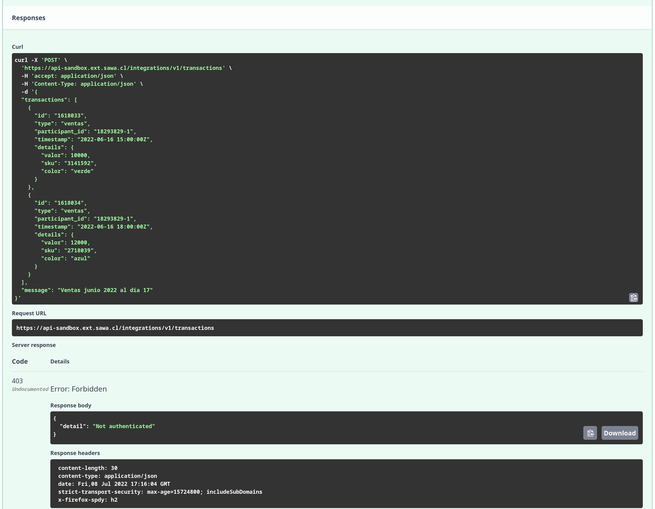 Recuerde siempre hacerle requests a https://api.ext.sawa.cl y no al sandbox. Cualquier error http con status entre 400 y 499 (inclusive) será del mismo formato que el sandbox. Sin embargo, los errores con status http mayor a 500 puede que difieran. Estos errores los monitorea SAWA y siempre serán arreglados a la brevedad.