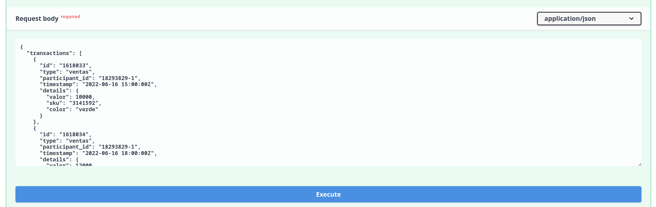 La imagen muestra un esquema de ejemplo que es válido para hacer un request y el botón Execute sirve para mandar el request al servidor.